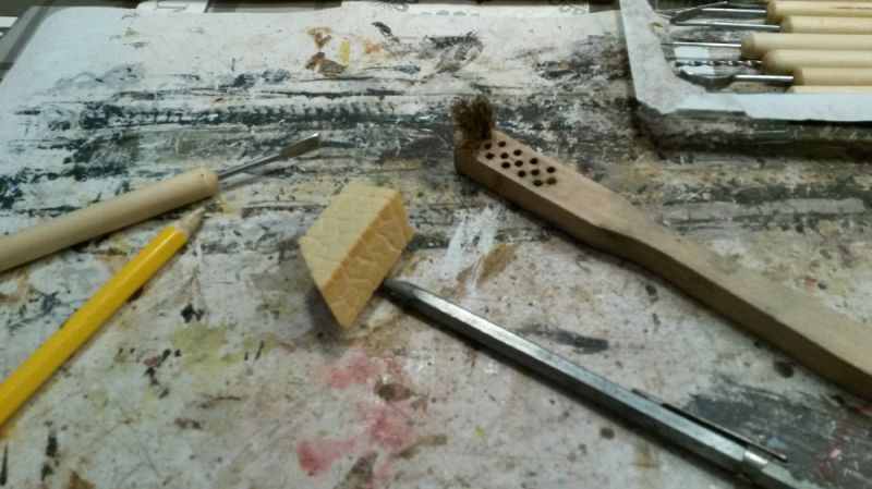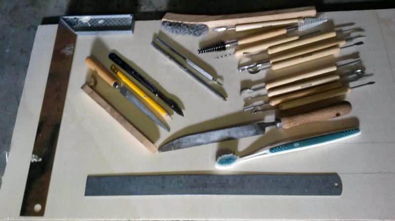 Allereerst de basis tools, een kraspen, sculp tooling, maatlat, potlood, blokhaak, enz...