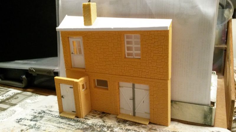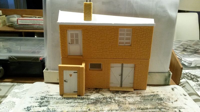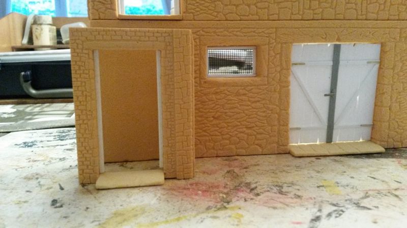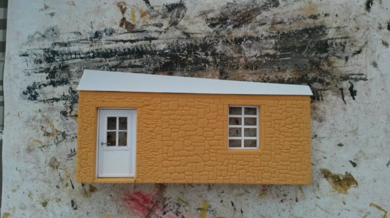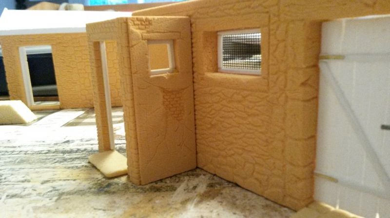 Aan de voorzijde komt deze luxe buiten wc die onder de voordeur van de 1e verdieping. De basis is Balsa-Foam, hardheid 20 pcf en de dikte is 6 mm. De afwerking zoals de deur en het raam wordt gedaan met Evergreen.