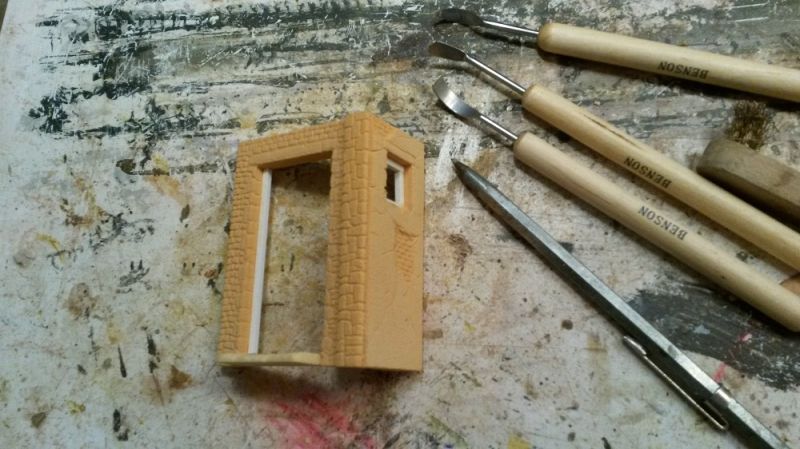 Tijd voor actie dus. Eerst maar eens de ruwe maten uitzetten en de ramen en deuren uitwerken. De structuur zoals de stenen breng ik daarna aan met de kraspen en diverse andere sculp tools.