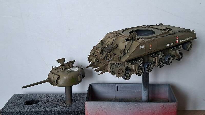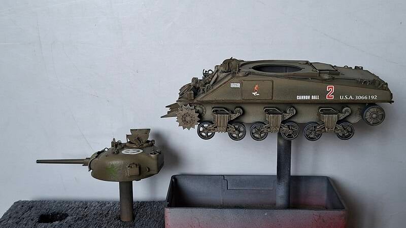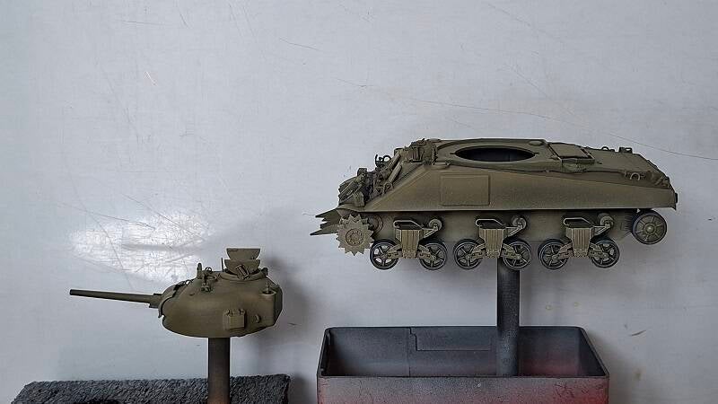 De Sherman is gespoten. De basiskleuren zitten er op.