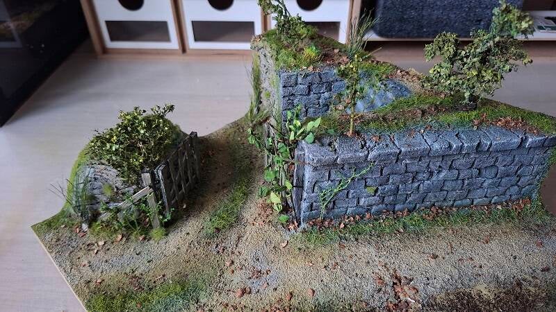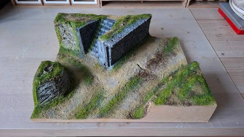 Muren gedrybrushed en de rots partij links bewerkt met diverse washes.