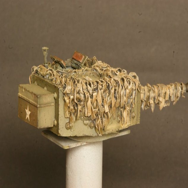 Het camo net is geheel Matt zwart gespoten, zo krijgen we een donkere schaduw tussen het jutte.