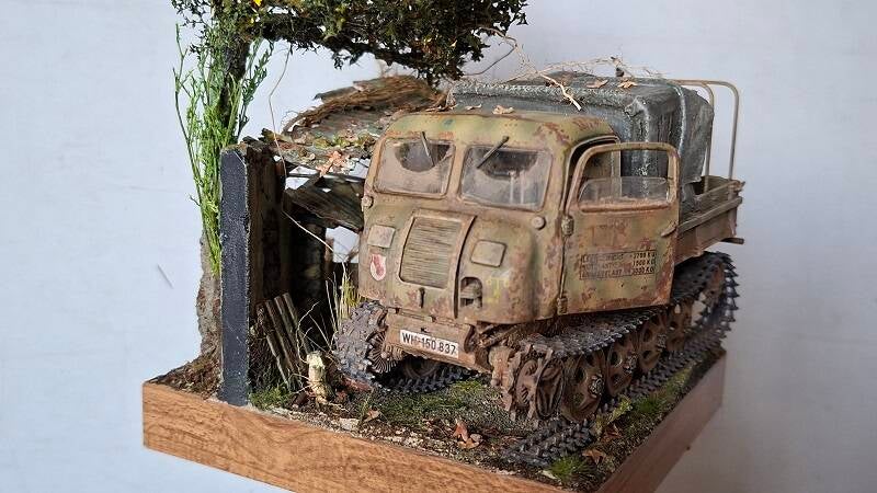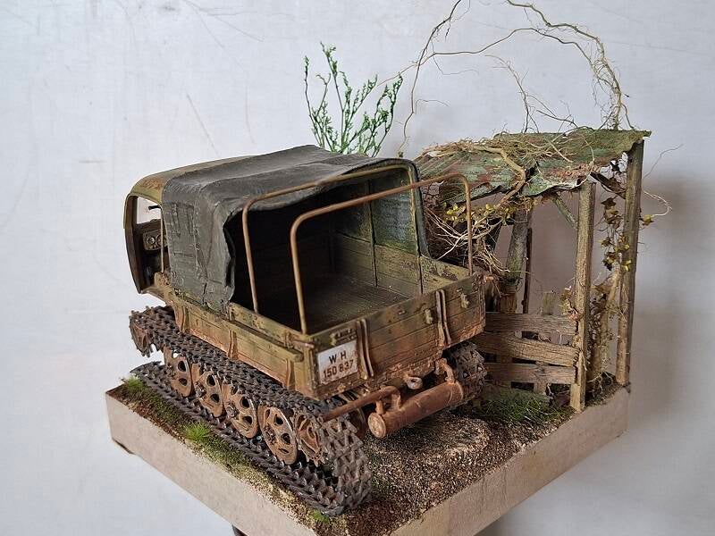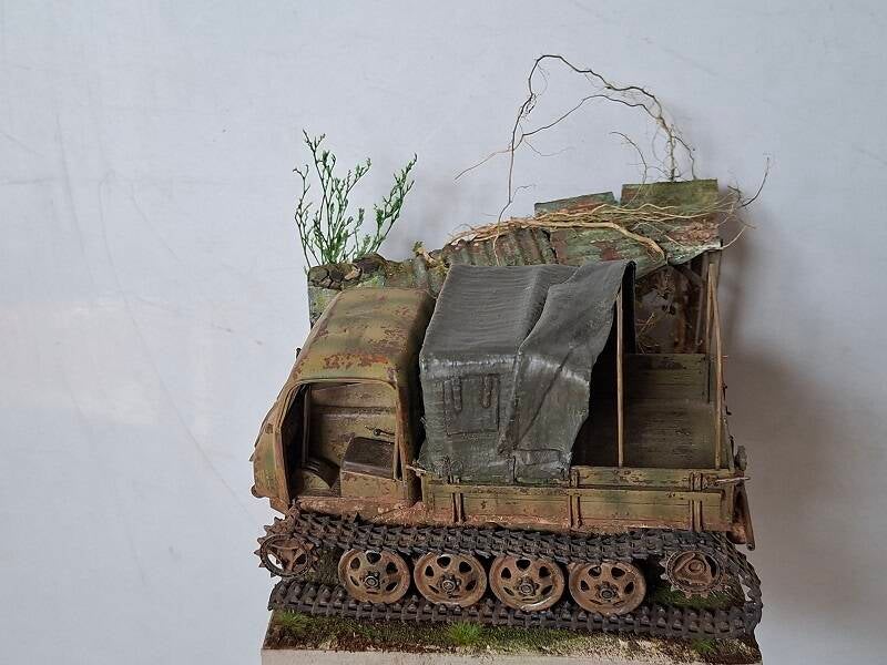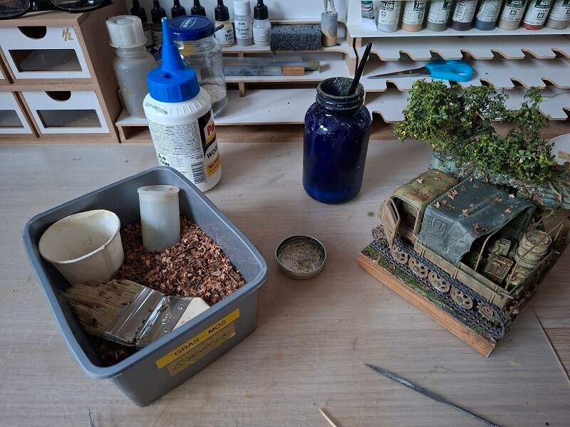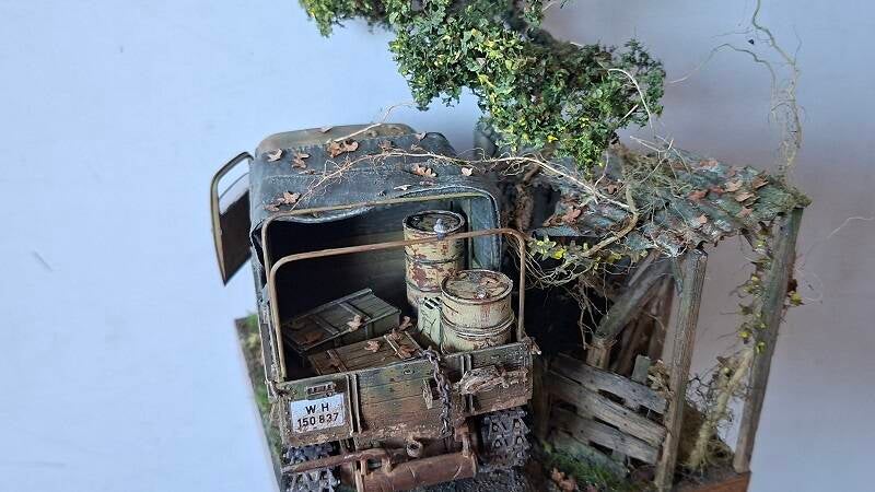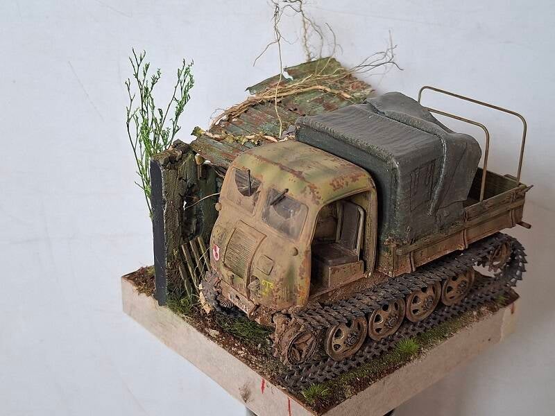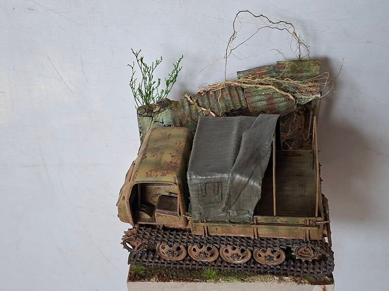 De basis staat, nu het geheel verder verweren en de onderkant met pigment poeders de modder en vuil aanbrengen.